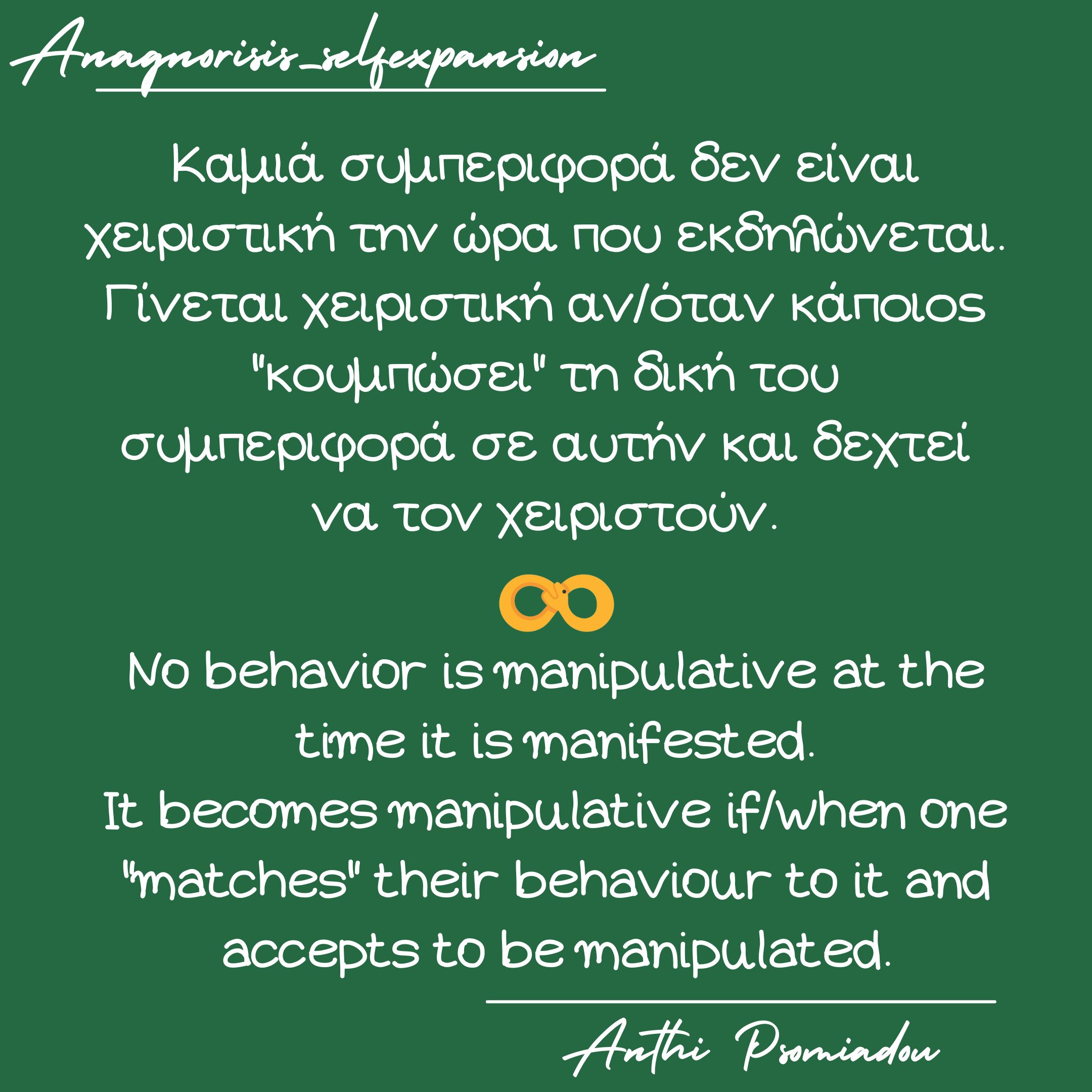 Γίνεται χειριστική τη στιγμή που κάποιος άλλος ή κάποιοι άλλοι «κουμπώνουν» πάνω σε αυτή τη συμπεριφορά τη δική τους και αποδέχονται να τους χειριστεί αυτός ο κάποιος (που μαζί είναι και ο εαυτός τους) λόγω κάποιας εσωτερικής ανάγκης, ενός φόβου, μιας έλλειψης.